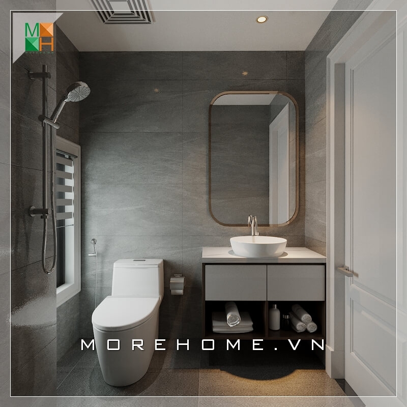 Thiết kế phòng tắm đẹp và hiện đại với ý tưởng sử dụng gam màu đơn sắc màu xám chủ đạo kết hợp chất liệu gỗ óc chó. Mẫu thiết kế sẽ là lựa chọn rất phù hợp trong các không gian vừa và nhỏ như chung cư, nhà phố, nhà liền kề,..