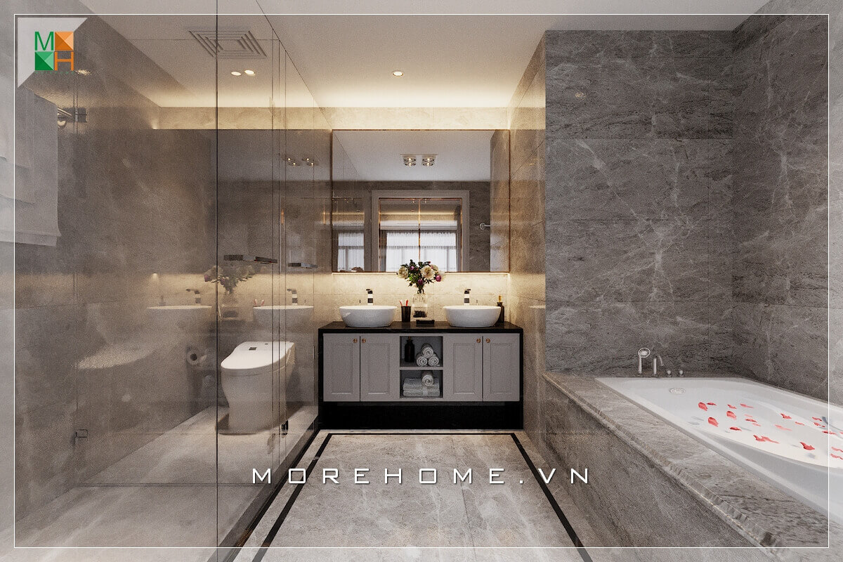 Phòng tắm biệt thự, nhà phố đẹp sang trọng sử dụng đá ốp lát cao cấp và kính ngăn hiện đại trẻ trung là không gian tuyệt vời, ấn tượng.