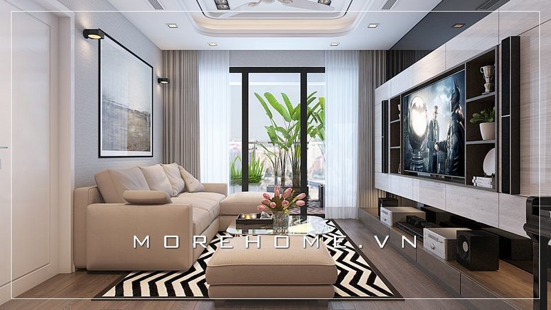 Mẫu sofa bọc vải màu trắng đơn giản cho không gian phòng khách hiện đại tạo nên không gian nhẹ nhàng, ấm cúng và tươi mới cho căn hộ chung cư