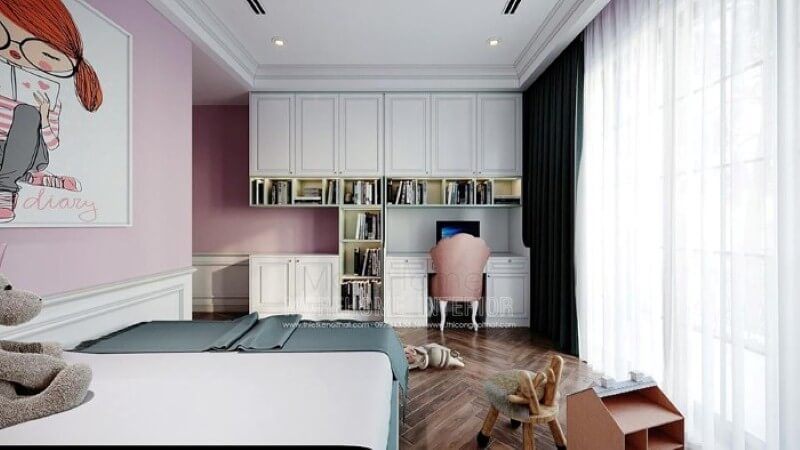 Bàn học liền kệ tủ trang trí đẹp, tiện nghi cho phòng ngủ bé gái.