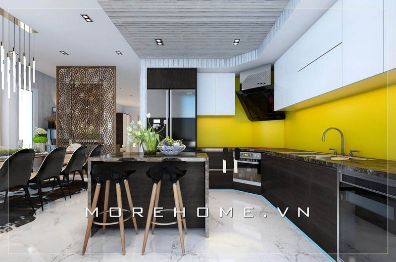 Thiết kế nội thất phòng bếp biệt thự hiện đại sử dụng tone màu trắng - đen tạo không gian hài hòa và ấn tượng