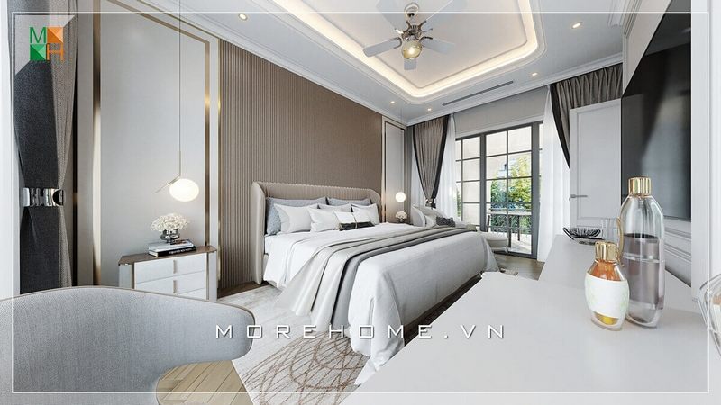 Phòng ngủ của biệt thự mang vẻ đẹp sang trọng đầy tinh tế với sắc trắng hiện đại và bố trí nội thất tâm điểm giường ngủ bọc da đầu giường ấm cúng.