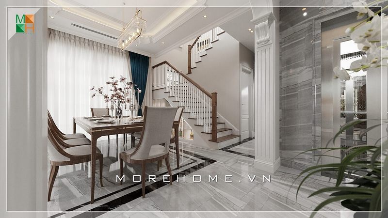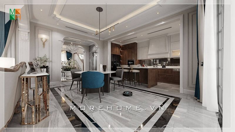 Vừa mang vẻ đẹp thoáng đãng vừa sang trọng khi bố trí phòng ăn liền phòng bếp trong một không gian rộng kết hợp sử dụng nội thất cao cấp xứng đáng là lựa chọn của gia chủ trong thiết kế biệt thự