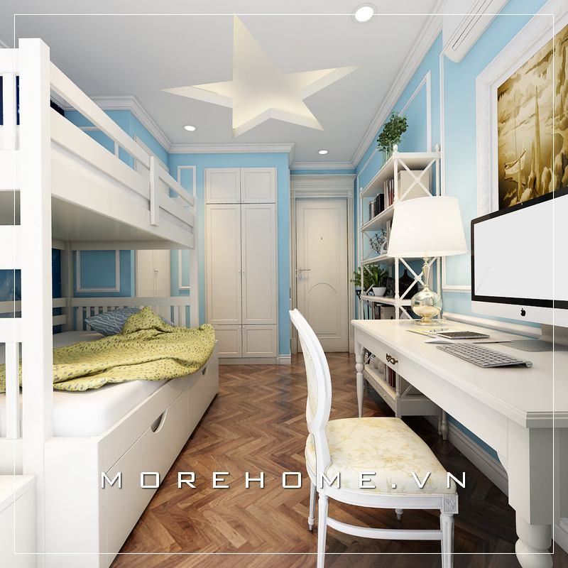 Tủ quần áo gỗ màu trắng được thiết kế kịch trần chạy dọc tường tạo cho không gian căn phòng thêm phần thoáng đãng, rộng rãi
