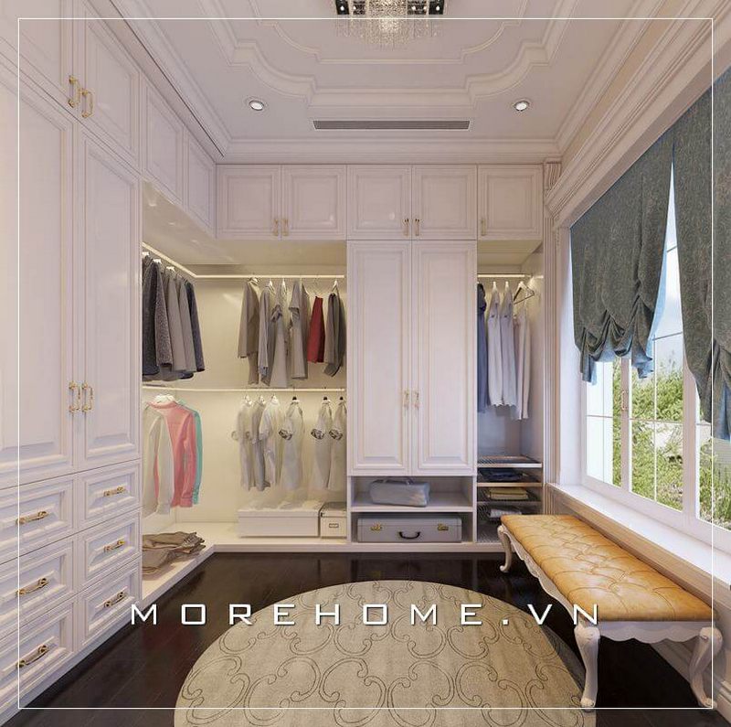 Hệ thống tủ quần áo và kệ tủ đều làm bằng gỗ sồi phun sơn trắng với những chi tiết góc cạnh tân cổ điển