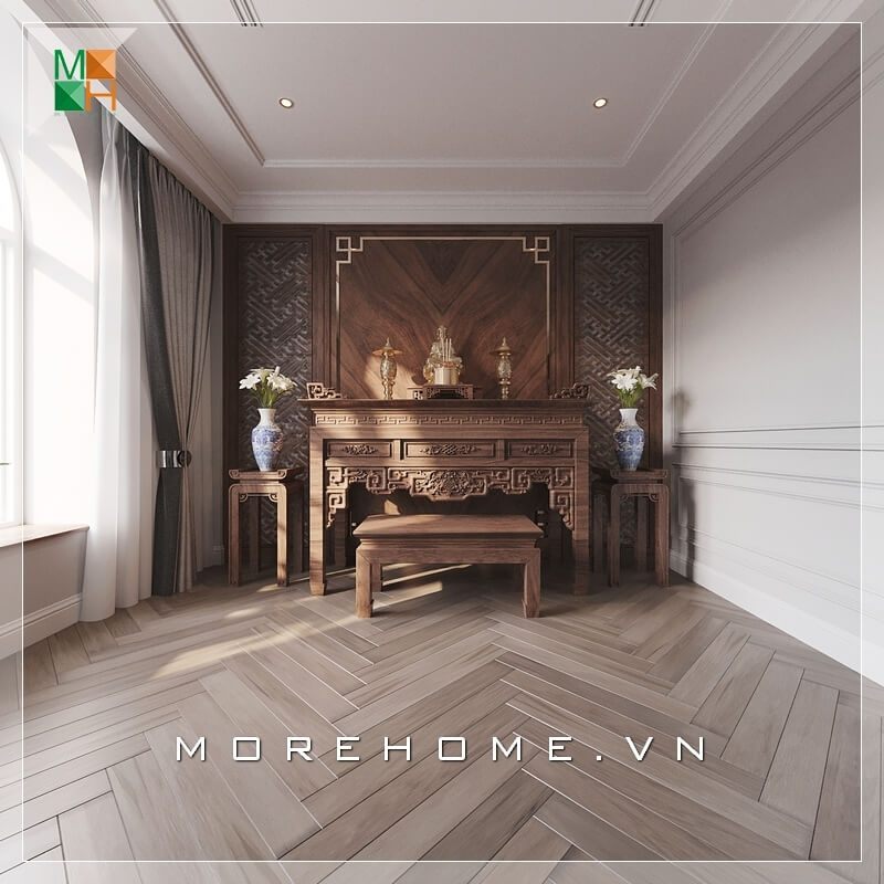 Sử dụng nội thất thiết kế từ gỗ óc chó cao cấp cho phòng thờ thêm linh thiêng và gần gũi.